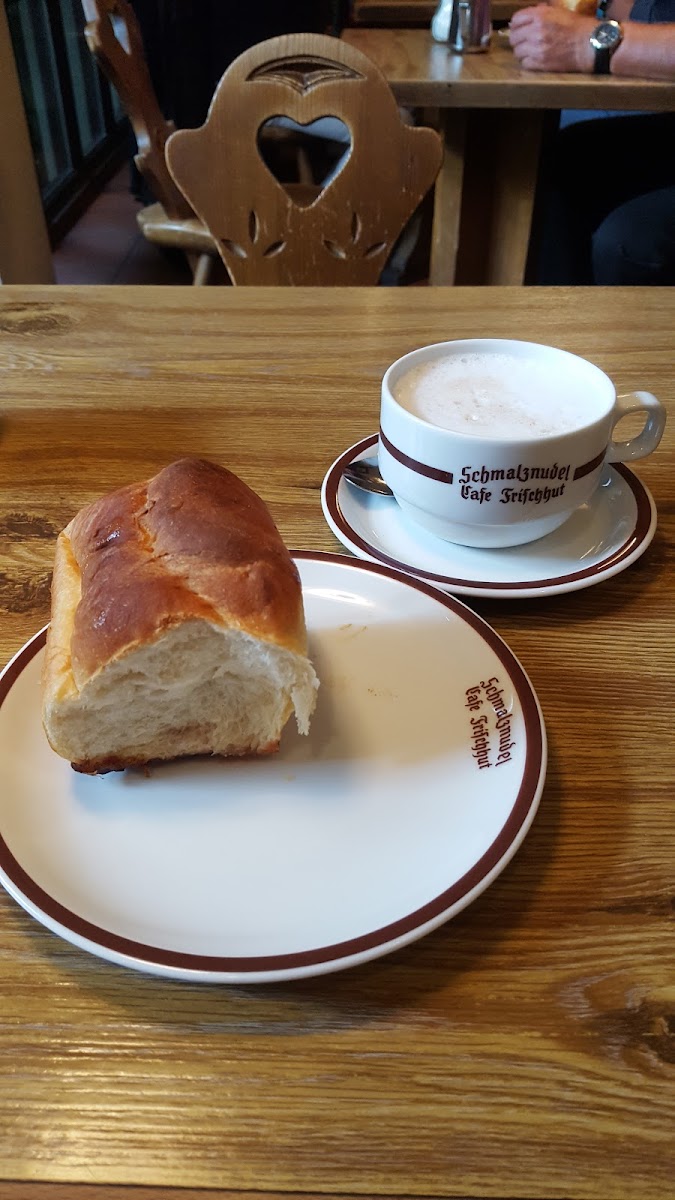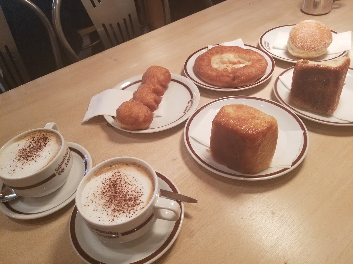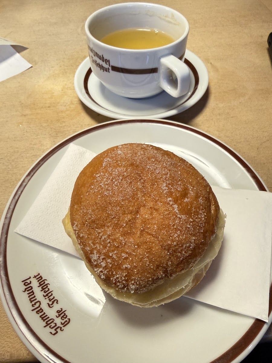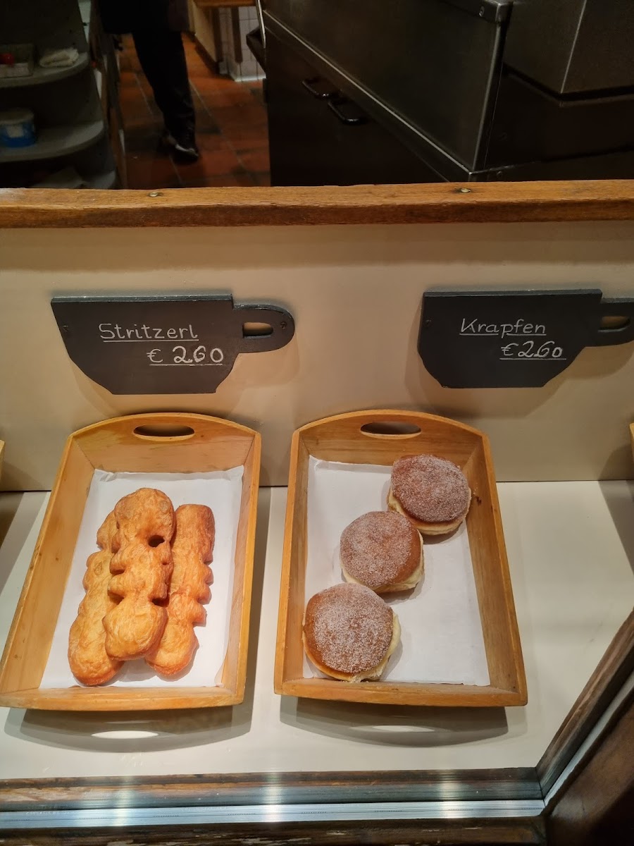 I wanted to try the schmaznudel but didn't have time to sit inside so i got two To go and we ate them outside. I then went back in and got another two they were so good. The second two we bought I carried around in my jacket for the next day when we were going to have an early train ride. They smelled so good all day, the next day we ate them stale and they were still amazing. Don't skip this spot.